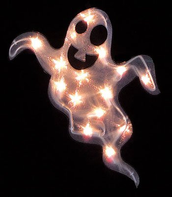 Flat light up ghost is double sided for viewing from both sides. Perfect for windows. Shimmering effect look 15 lt. bright light measures 12" wide. Indoor/Outdoor.Available at Amazon
