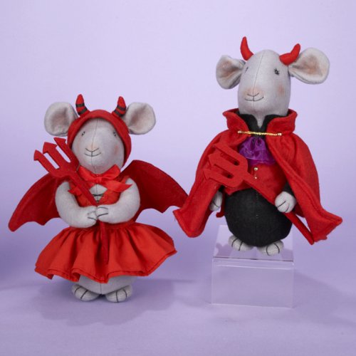 These red devil mice are ready to party this Halloween! Dressed in bright red cap and vest with a purple scarf at his neck, the boy mouse has is red horns on and a pitchfork in his hand. The girl mouse is a ruffly red dress with red wings and a red hat with horns.These guys are so cute you will want to have both of them join you at your Halloween festivities this year.Available at Amazon