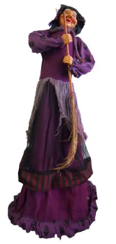 She's nearly 3 feet of spellbinding terror. This sound and/or touch activated witch prop stands tall and stable with her tripod base and when triggered her eyes glow bright red and she gives off a loud audible cackle. Garbed in eerie fall colors, this witch has all the traditional witch features: Pointed hat, crooked nose, large mole, tattered clothing, and broom stick. Just insert the required batteries, stand her up and either clap or squeeze her to make the toil and trouble come to life. At a whopping 35" in height, this witch is sure to add some spectacularly spooky decor to any Halloween scenario. Please note: Colors may vary see our 29 inch and 47 inch Witch for colors.Available at Amazon