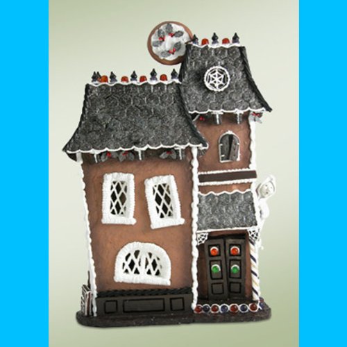 Delectable looking haunted gingerbread house is embellished with faux purple and orange gumdrops, faux chocolate doors and window shutters, faux icing windows and molding, and black liquorish outlining the shimmering faux ginger cookie rooftops