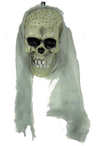 Spruce up your Halloween decorations this year by adding this shrunken skull to the mix. This decoration features a human skull with mesh netting hair attached to the top of it. Best part is it's ready to hang immediately, whether on a door knob, hook, wrist or more, or just free stand it on a table, desk, chair, etc... Great Halloween decoration.Available at Amazon